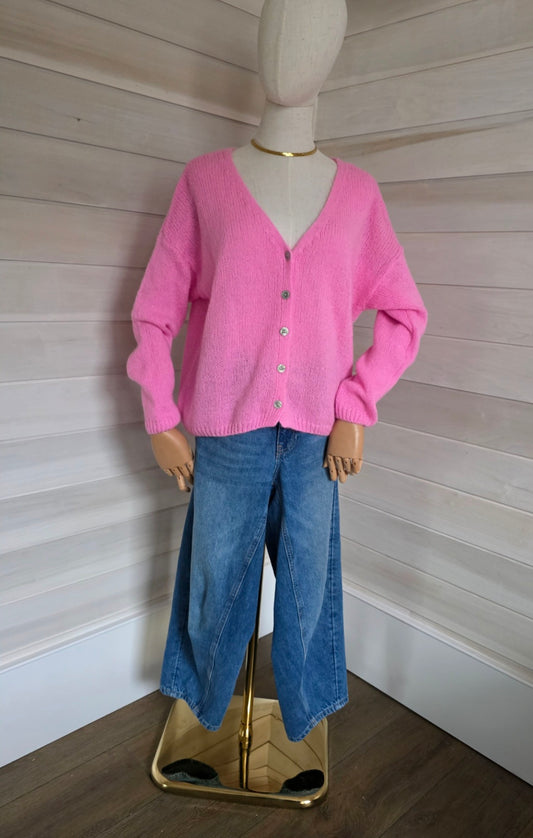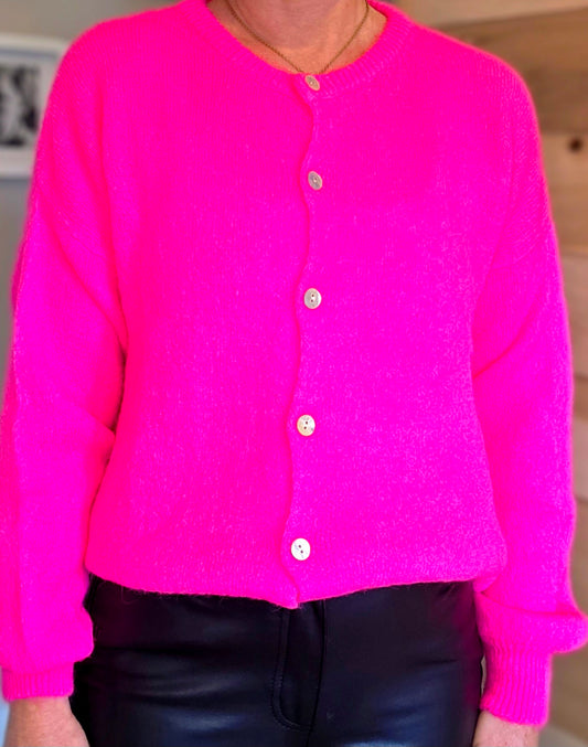 *Restocking. Pls select Notify me * Neon Pink V Neck Ladies Cardigan. Long sleeves. Mohair mix