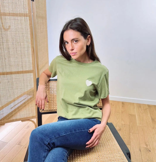 Heart Embroidered V-Neck Cotton Tee – Dusty Pink