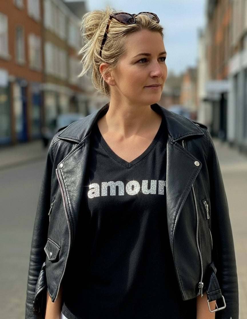 Discover timeless elegance with our stunning Italian-made black V-neck t-shirt for women. Adorned with a beautiful silver "Amour" graphic, this one-size ladies' top is designed to flatter UK sizes 8 to 12. Crafted for comfort and style, it's the perfect addition to your wardrobe for effortless chic. Experience the quality of Made in Italy clothing.