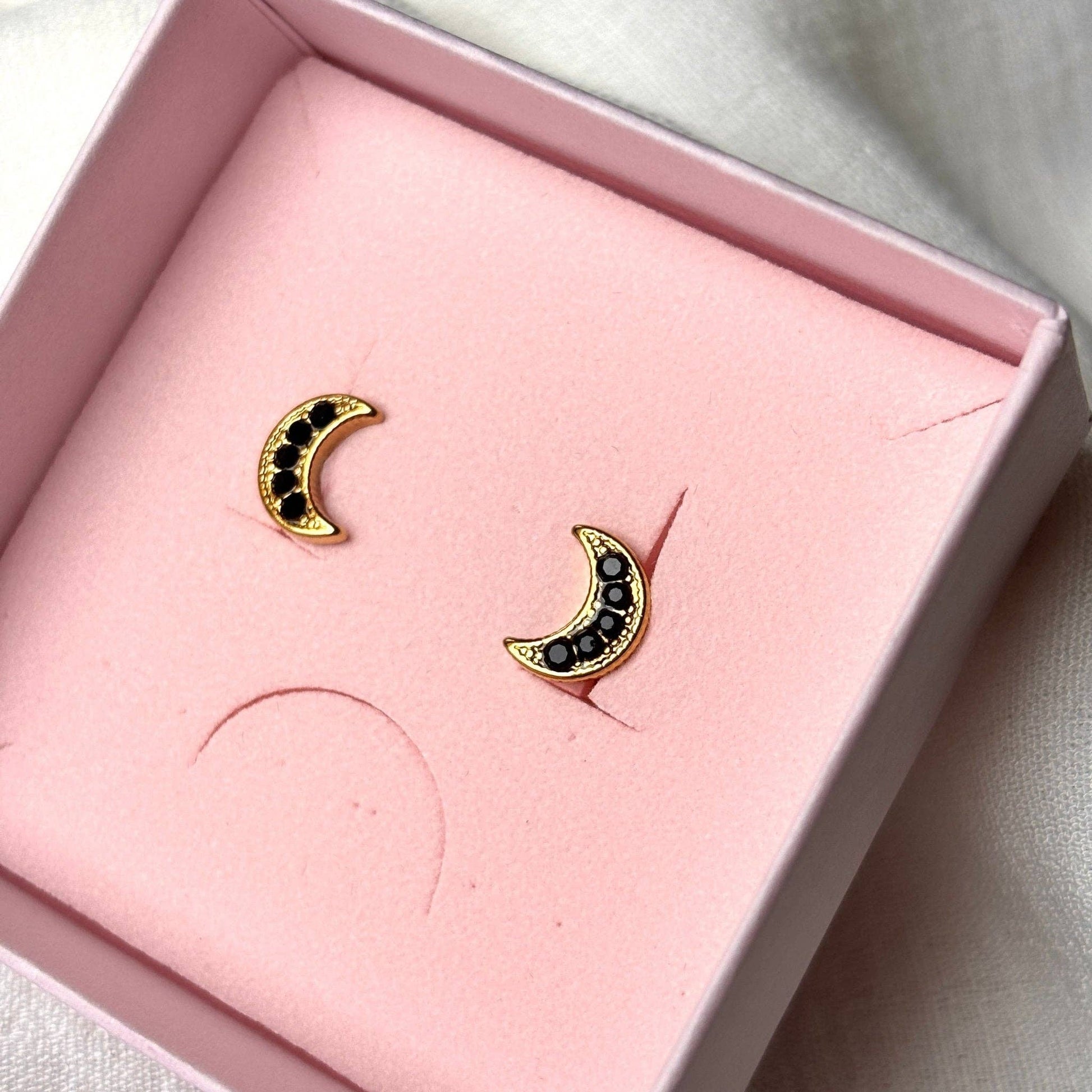 Shine even at night with our 18k gold-plated stainless steel crescent moon earrings, adorned with sparkling black zircons.