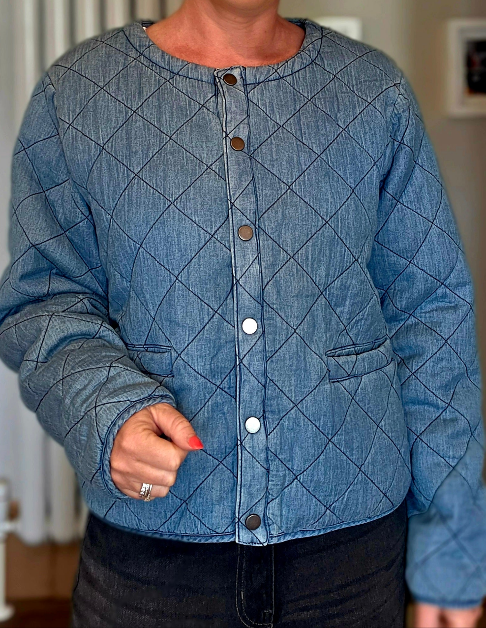 Collarless, Quilted Denim jacket with buttons in pure cotton.