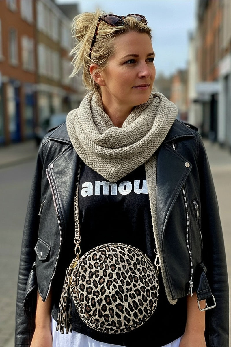Leopard Print Round Suede Crossbody Bag – Handmade Italian Leather. 20cm wide x 20cm high