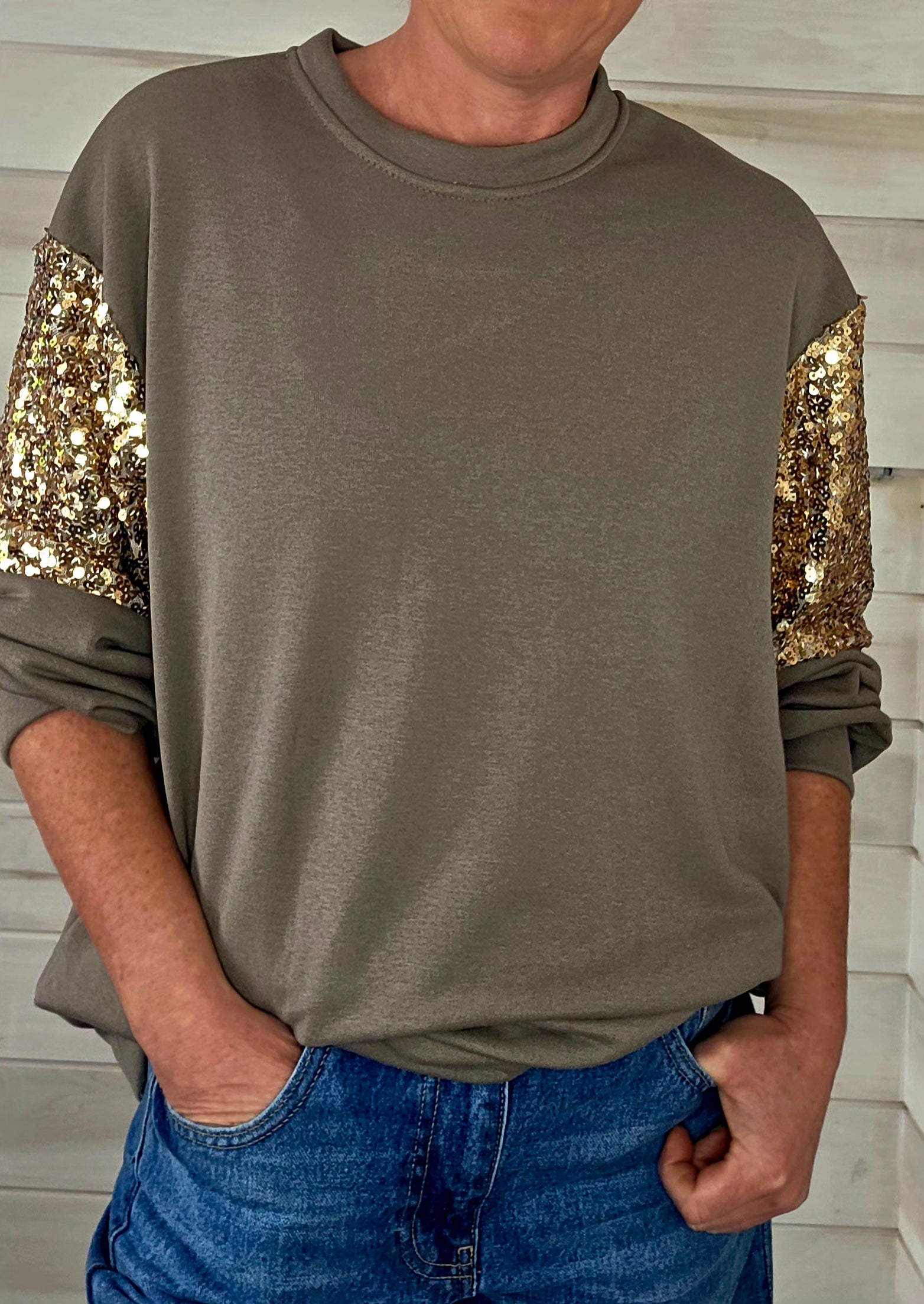 Taupe Cotton sweatshirt with sequin detail on sleeve